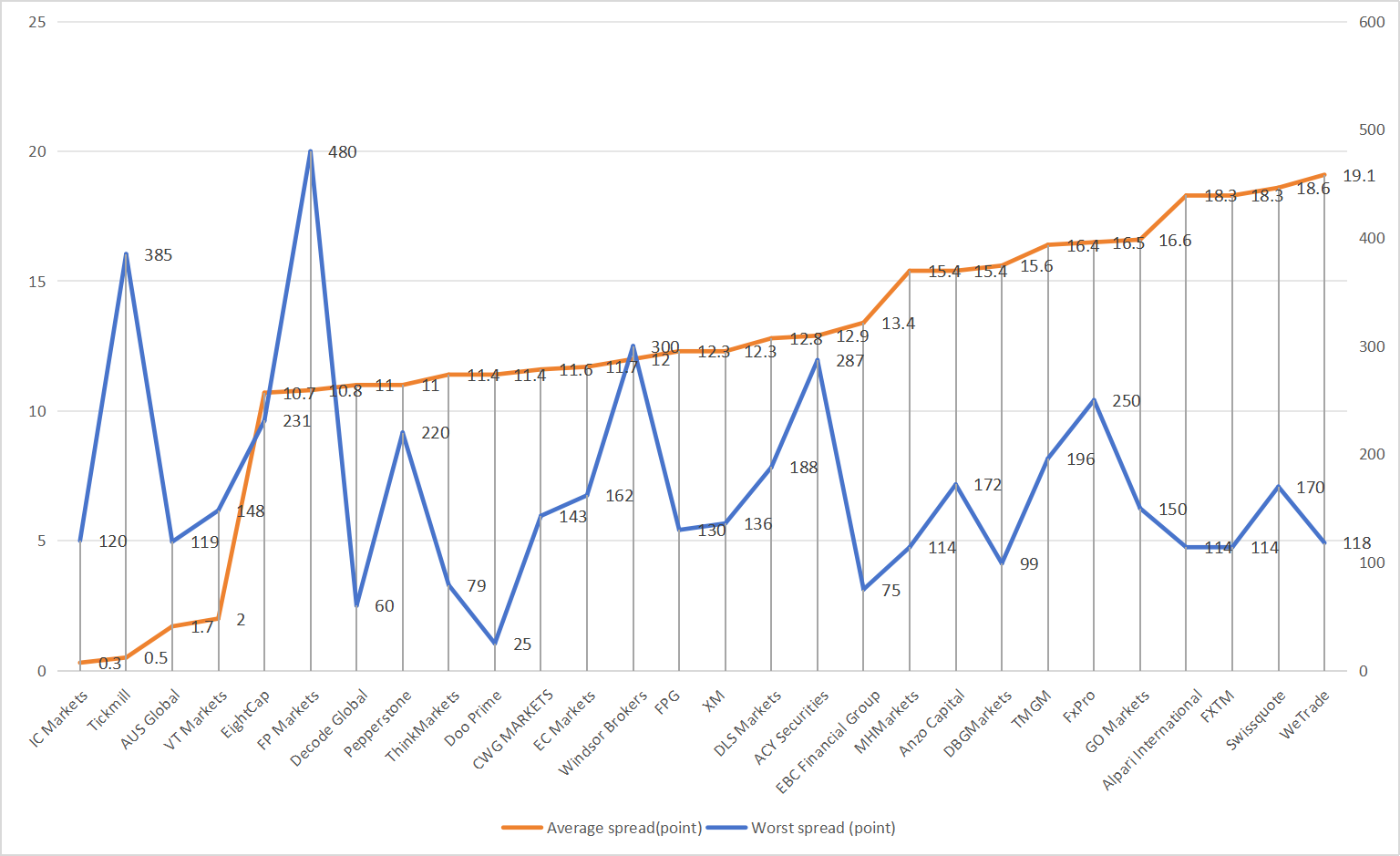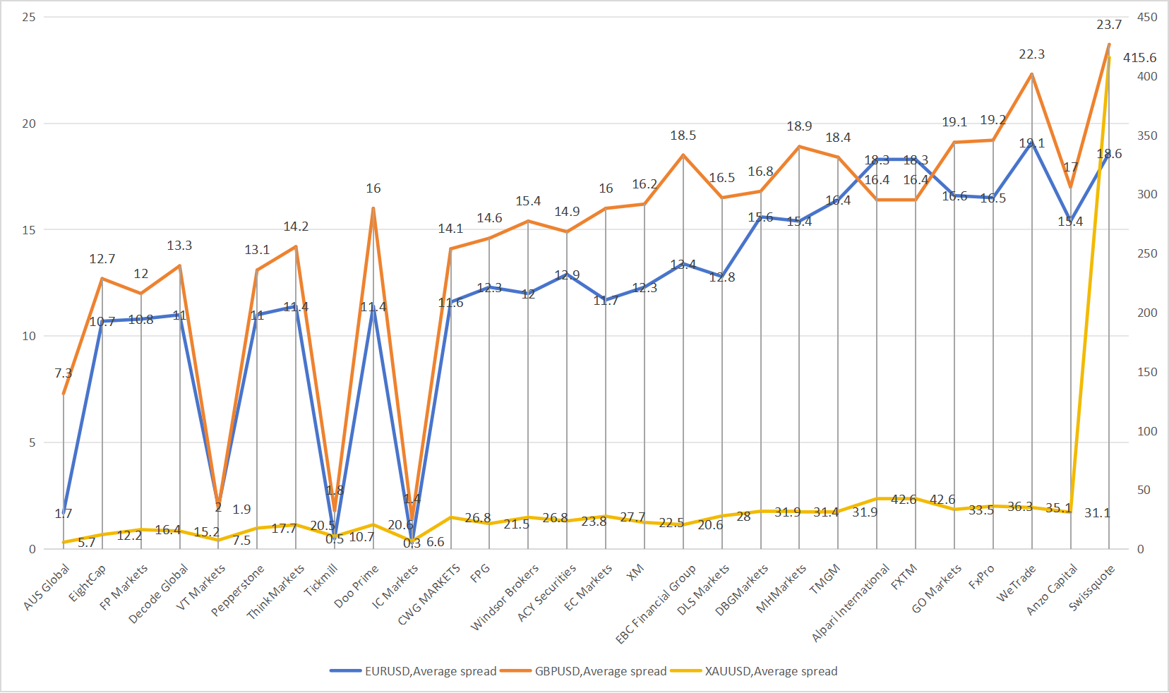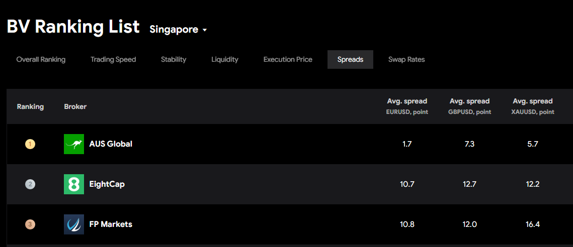NO.1: AUS Global, the average spreads of EURUSD, GBPUSD and XAUUSD are 1.7, 7.3 and 5.7 points respectively;