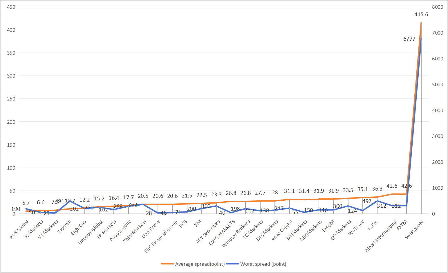 AUS Global's average spread this month is 5.7 points, and the maximum spread is 190 points;