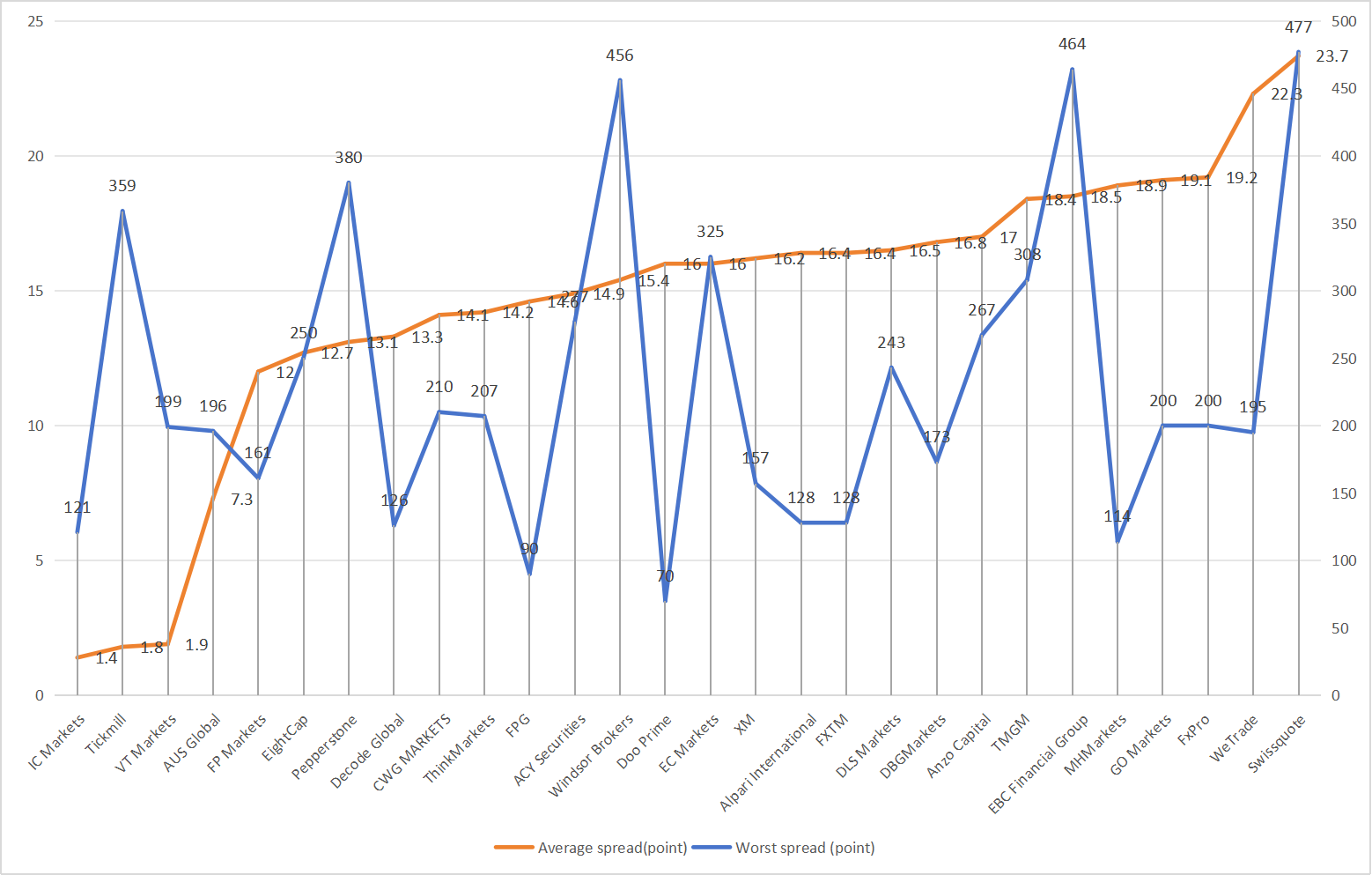 Swissquote's maximum spread this month is 477 points, and the average spread is 23.7 points;