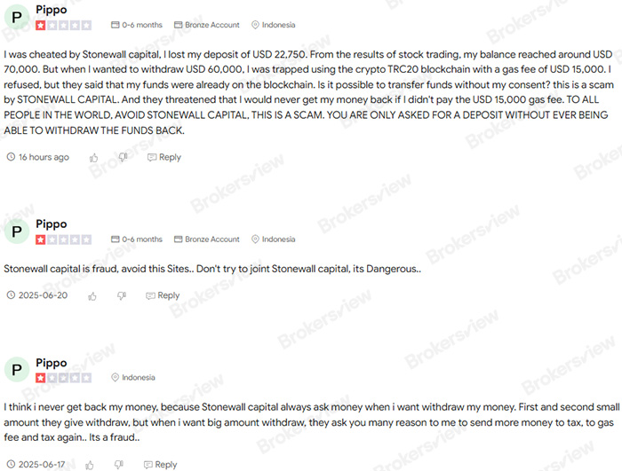 Another Indonesian trader also reported on BrokersView that Stonewall Capital repeatedly demanded payments disguised as “tax” and “gas fees” during his withdrawal attempts. The trader warned: “YOU ARE ONLY ASKED FOR A DEPOSIT WITHOUT EVER BEING ABLE TO WITHDRAW THE FUNDS BACK.”