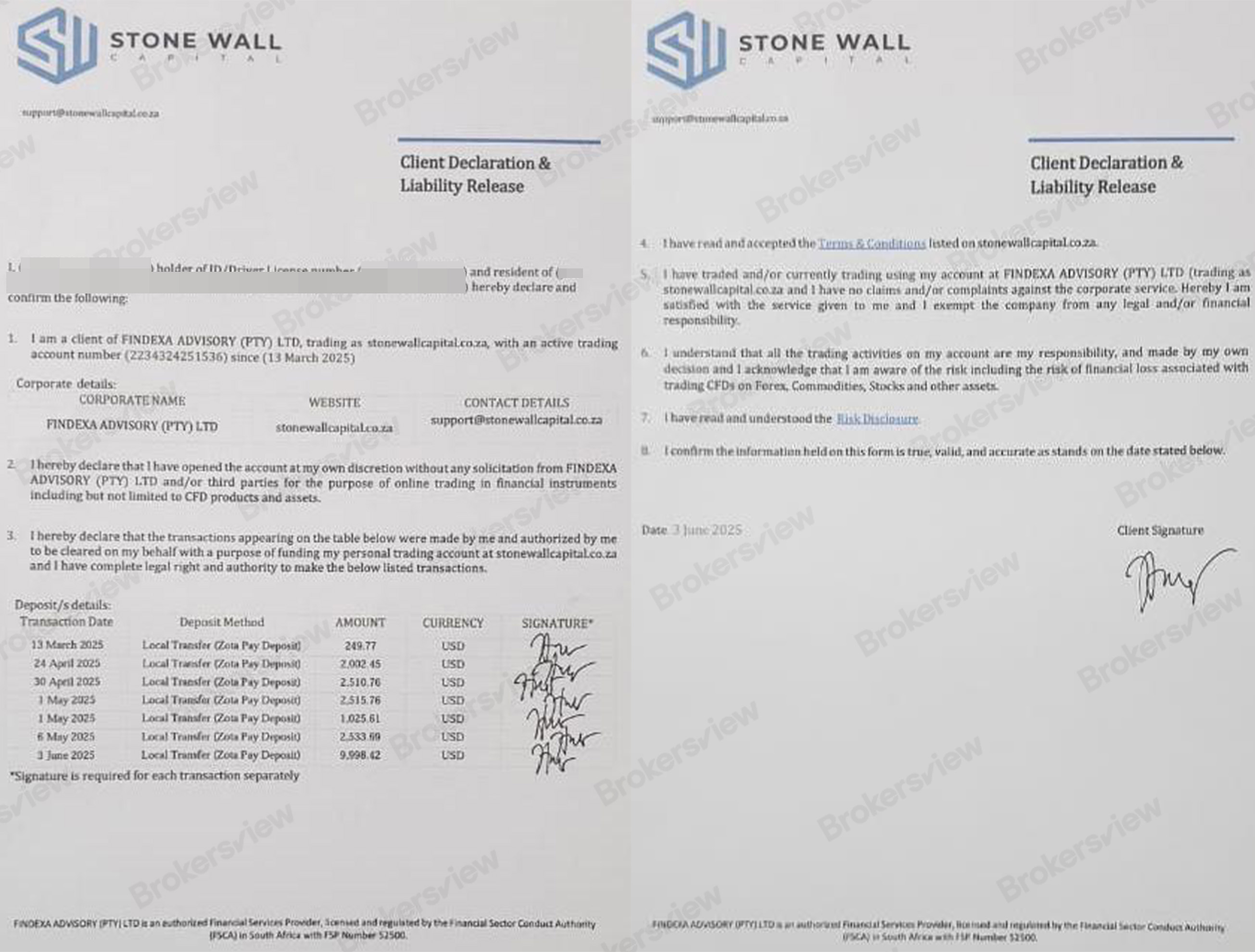 Stonewall Capital claims to operate under FINDEXA ADVISORY (PTY) LTD, a Financial Services Provider licensed by South Africa’s Financial Sector Conduct Authority (FSCA). However, the FSCA registry does not display the licensee’s associated domains, introducing uncertainty and potentially posing a risk of identity fraud.