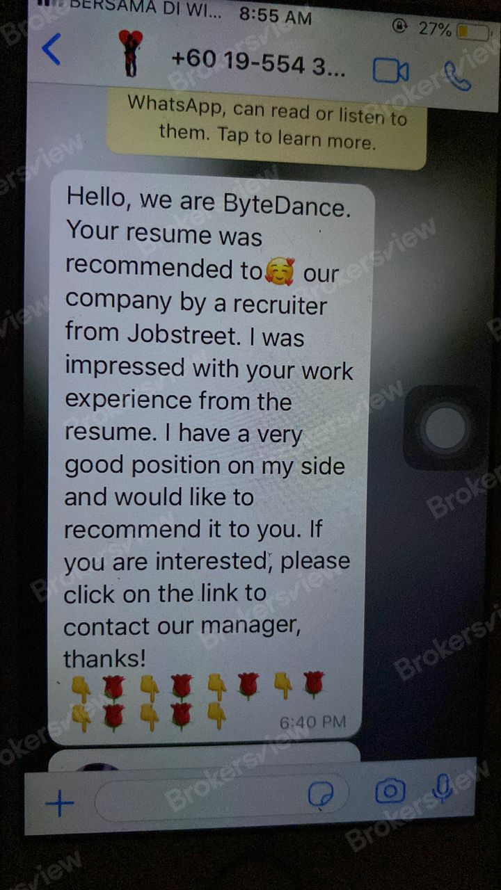 A user shared the screenshot of a job offer on BrokersView and said the job was a trap. It seems that staff from "ByteDance", the parent company of Tiktok, was inviting the user to work with them.