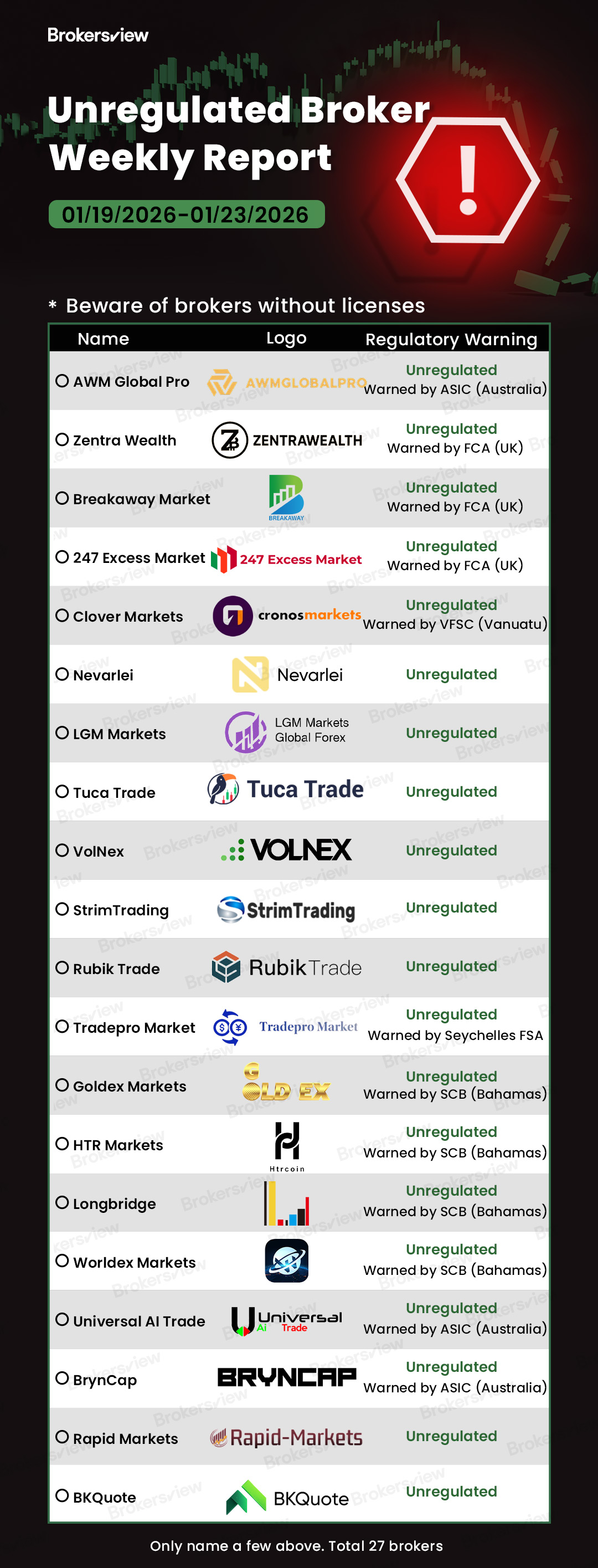 During the past week, BrokersView exposed 27 fraudulent brokers. Investigations revealed that these brokers lack authorization from any financial regulatory authority, constituting typical unlicensed operators potentially violating financial services laws across multiple countries and regions.