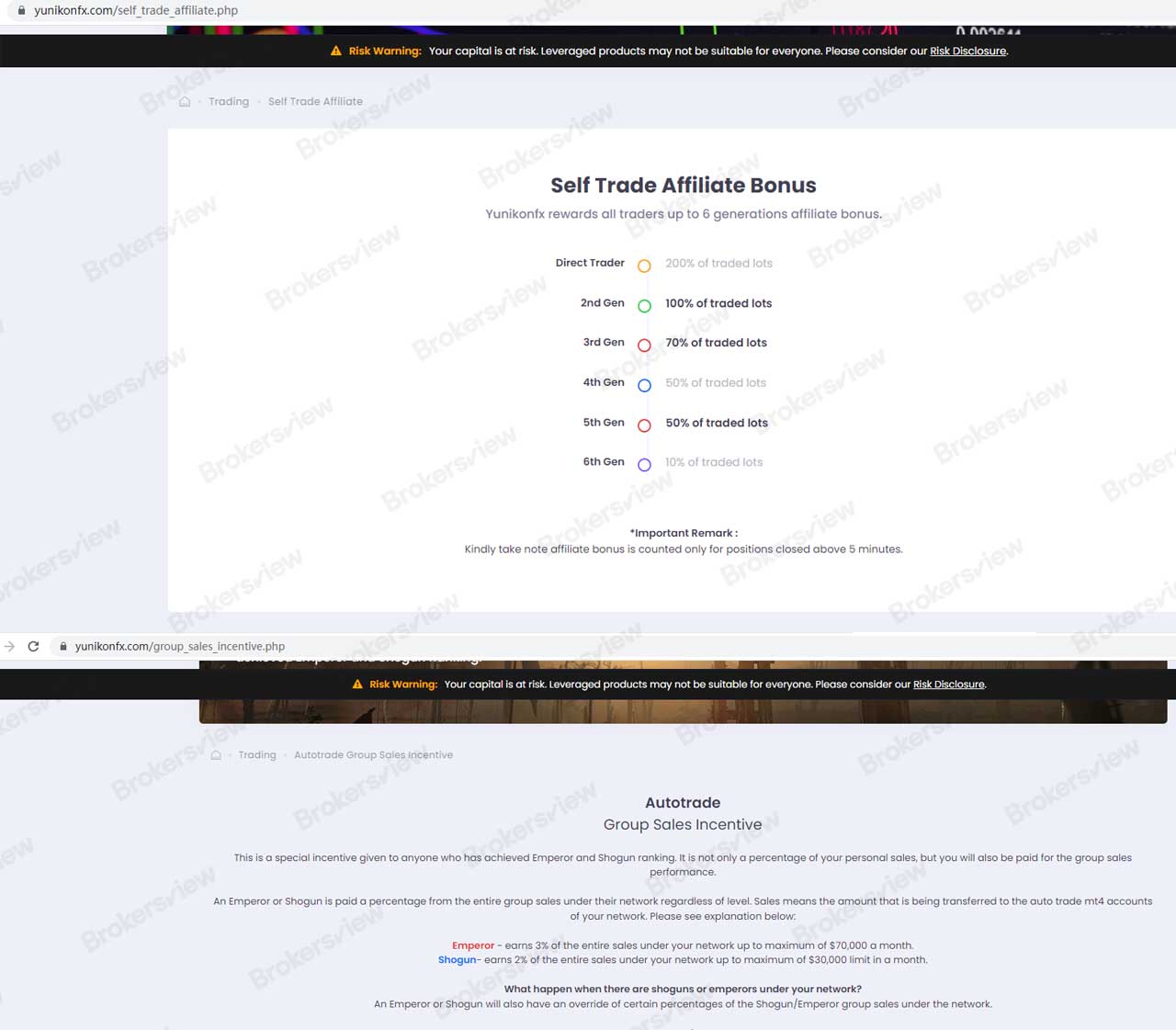 Likewise, YunikonFX rewards all traders with up to six generations affiliate bonus. They also tempt participants with the "Group Sales Incentive", stating that anyone ranking at Emperor and Shogun could receive a percentage from the entire group sales under their network. Such tactics clearly indicate that YunikonFX is a Ponzi scheme disguised as a forex trading broker.