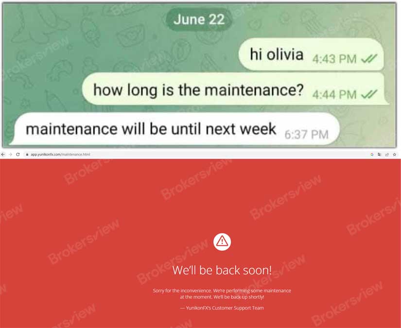 On June 22, when a user inquired about the expected duration of maintenance, YunikonFX stated that the website would be running smoothly the following week. However, as of today, the client-side remains inaccessible, significantly undermining the broker's reliability.