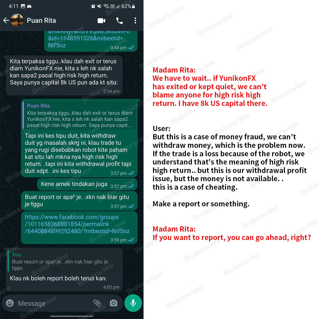 Madam Rita, one of YunikonFX's leaders, claimed that pending withdrawals submitted in April and May would be in process in five days, starting from 21st June 2023, and June pending withdrawal would be addressed from 26th June 2023. However, a victim told us that no money had been received as of June 28, 2023.
