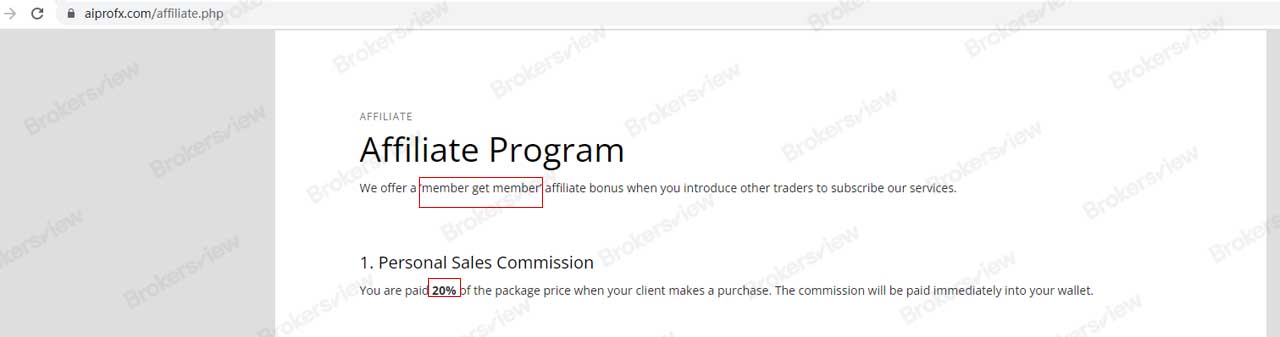 Furthermore, AIProFX offers a "member get member" affiliate bonus of up to 20%, a typical characteristic of the pyramid scheme.