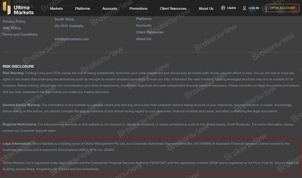 The broker also states that Ultima Markets Ltd is registered with Saint Vincent and the Grenadines Financial Services Authority (SVG FSA) under number 26330. A search shows that there is indeed a registered company in the SVG FSA called ULTIMA MARKETS LTD, but we have repeatedly reminded our users that the SVG FSA does not regulate or authorize forex companies.