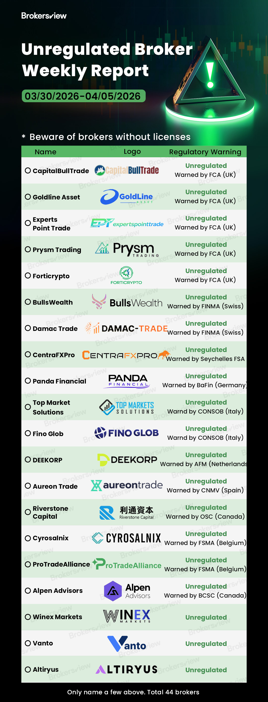 Another week, another wave of fraudulent brokers removed from the shadows. Between March 30 and April 5, Brokersview identified and exposed 44 Unregulated Brokers operating without proper authorization or using deceptive clones of regulated firms. These platforms have been flagged by major regulators including the FCA (UK), BaFin (Germany), CONSOB (Italy), FINMA (Switzerland), and others.