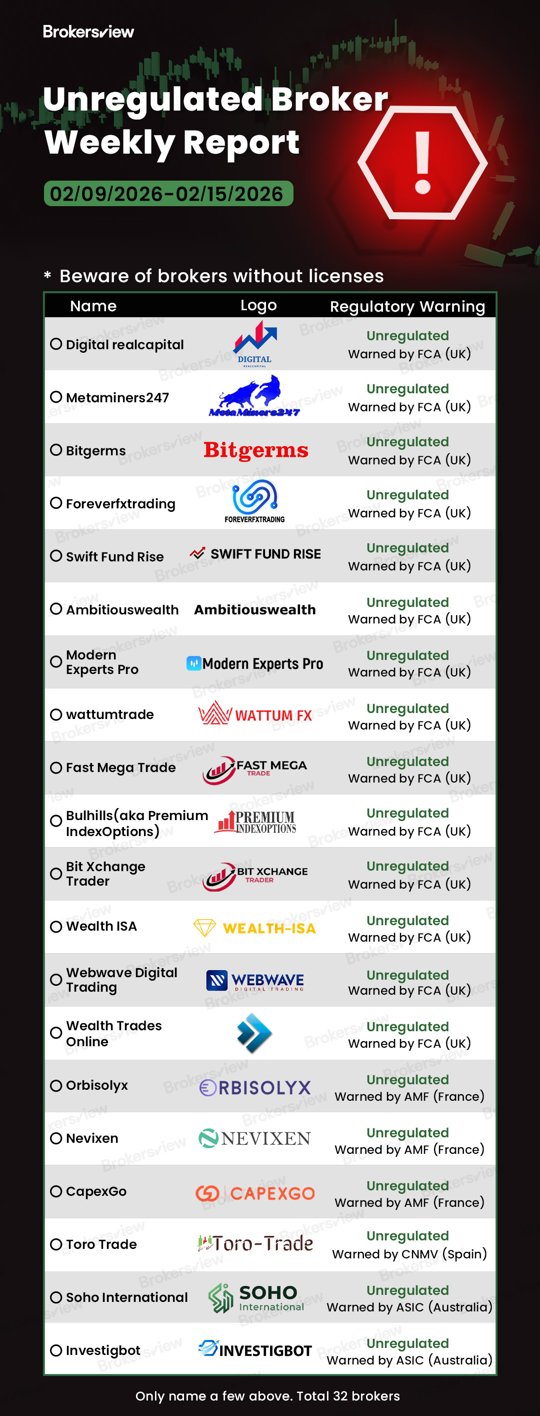 A new investigative report released by BrokersView has identified 32 unlicensed brokers during the week of February 9 to February 15, 2026. According to the findings, none of the listed entities hold authorization from any recognized financial regulator, classifying them as unlicensed operators that may be violating financial services laws across multiple jurisdictions.