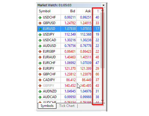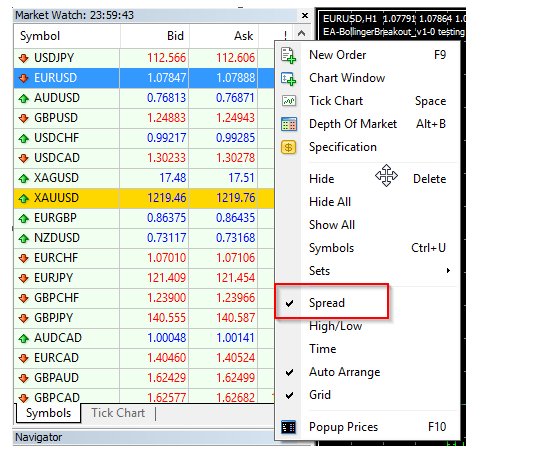 To enable the spread display in Market Watch, right-click the header and tick the Spread entry in the menu.
