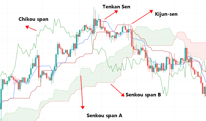 The Ichimoku Hinko Hyo is a momentum indicatorused to recognize the direction of the trend. It can also define accurate support and resistance levels. It consists of five lines, which are the tenkan-sen, kijun-sen, senkou span A, senkou span B, and chikou span.
