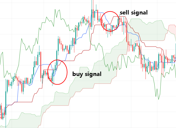 Since the Ichimoku is a trend indicator, it is most effective in trending markets. The tenkan sen and the kijun sen are both moving averages. One of the most popular strategies offered by normal moving averages is the crossover. This is the primary Ichimoku trading strategy of these two lines and of the leading indicator. When the tenkan sen crosses over the kijun sen, this is a signal to open a buy position. Conversely, when the tenkan sen crosses below the kijun sen, this is a signal to open a sell position.