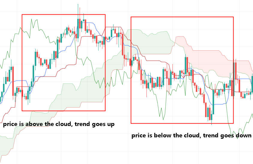 By employing the Ichimoku trading strategy, you can see the relevant information about your trade at a glance, by using averages. The overall trend goes up when the price rises above the cloud. Conversely, the trend goes down when the price falls below the cloud. However, when the price stays in its position in the cloud, the trend or transition ceases to exist.