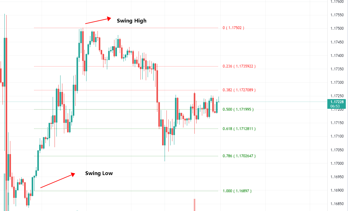 In the chart above, the Fibonacci retracement levels are plotted using the Swing Low at 1.16897 and the Swing High at 1.17502. The retracement levels are 1.1735922 (26.3%), 1.1727089 (38.2%), 1.171995 (50%) and 1.1712811 (61.8%).
