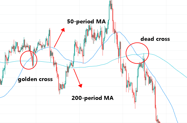 As the chart above, when the 50 MA crosses over the 200 MA to the upside, you have what traders call the Golden Cross. Enter a buy trade. A Death Cross occurs when the 50 MA crosses the 200 MA to the downside. And this is a signal for a short order.