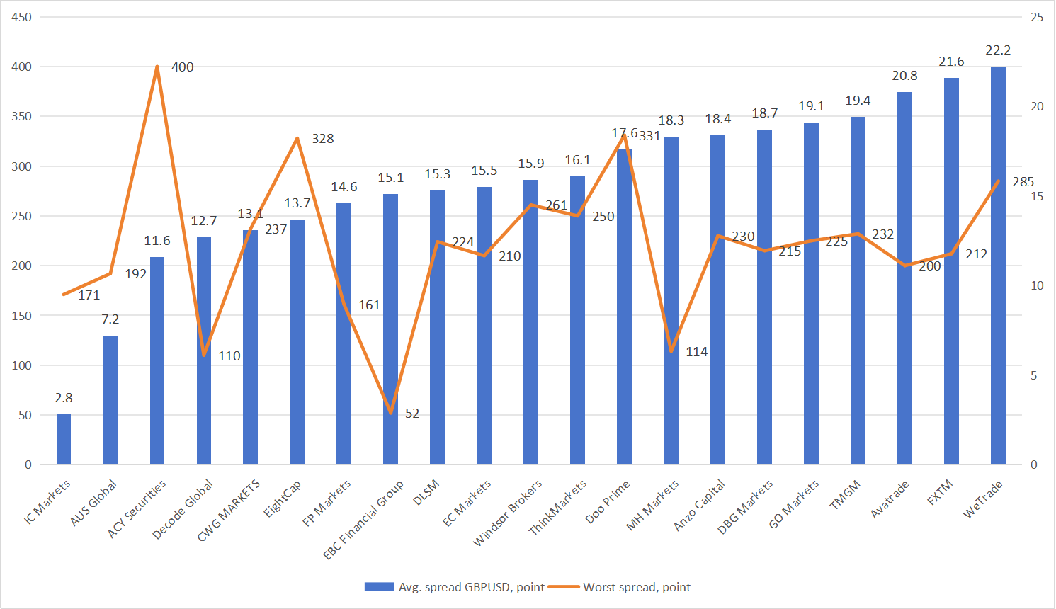 IC Markets again tops the list, offering a very competitive 2.8-point average on GBPUSD. The worst spread recorded (171 points) is reasonable given GBPUSD’s inherent volatility.