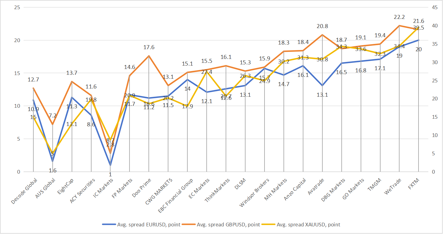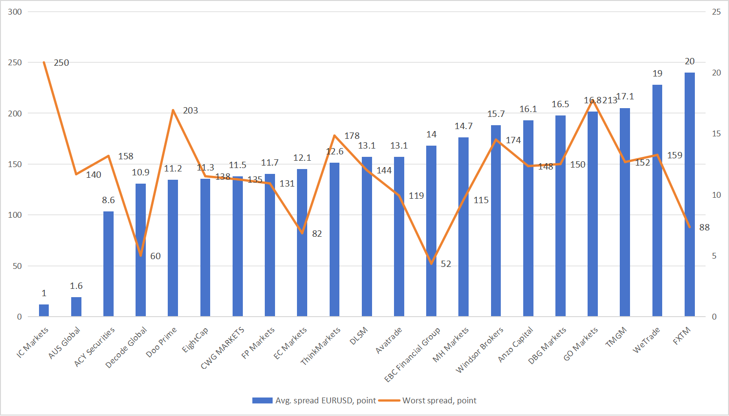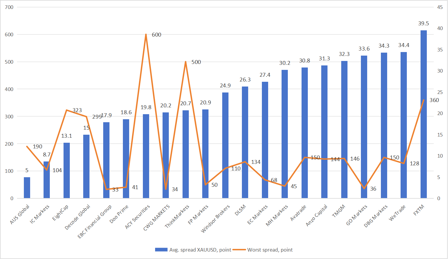 AUS Global delivers a mid-tier average spread at 7.2 points, though it does show higher spread risk with worst cases reaching 192 points.