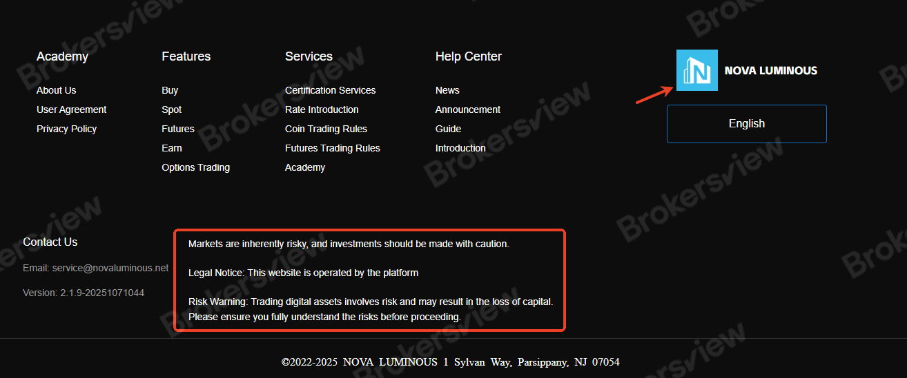 At the bottom of their homepage, only generic risk warnings and a legal notice stating "This website is operated by the platform" are provided, without any license numbers or regulatory links that can be verified via official authorities (the complainant provided the URL https://web.novaluminous.net/, and a related site appears to be https://www.novafmspro.com/). Observations of the site layout and content reveal the absence of clear regulatory sources, missing verifiable company registration details, and technical email errors in customer support — all of which raise serious concerns.