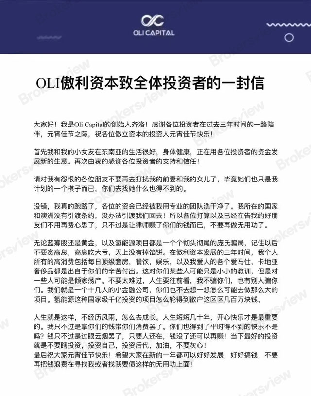 February 5, 2023, the founder of Oli Capital, Luo Qi, sent a letter to all his investors, arrogantly stating that he had run away with the money.