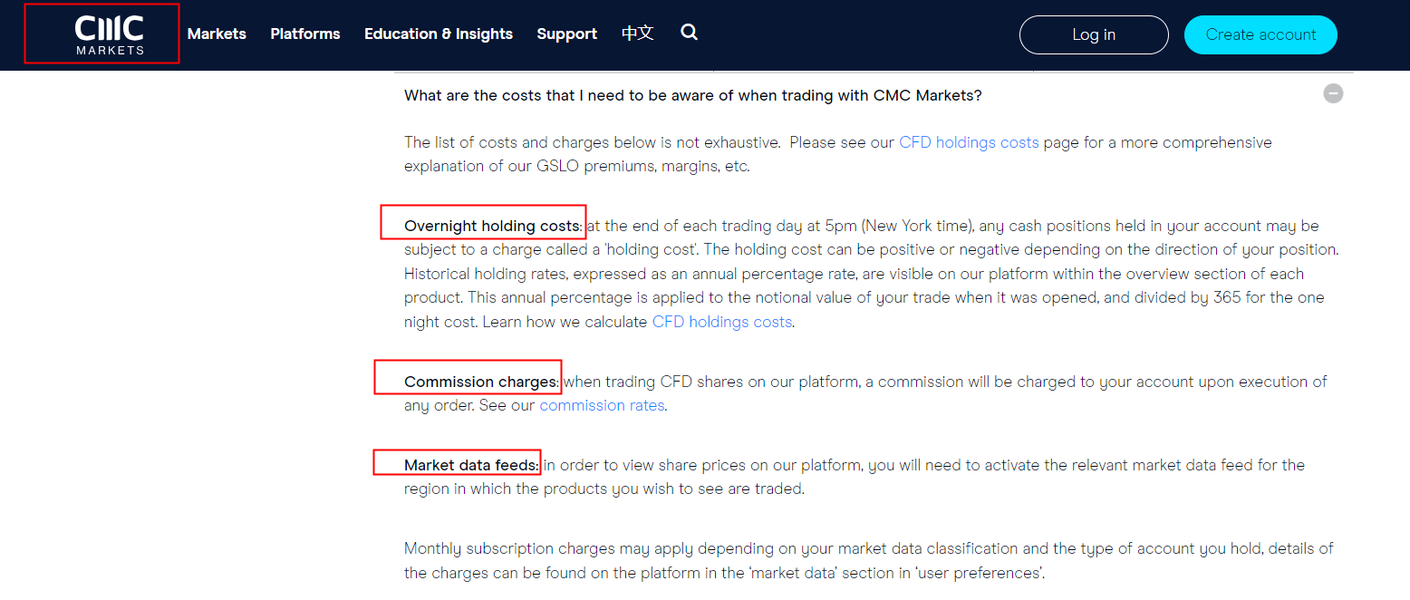 Thank you for reaching out. CMC Markets charges various fees, including an inactivity fee (for accounts with no trading activity for 12 continuous months), holding costs, commissions, and market data feeds. You can find detailed information on their respective category pages or the Charges FAQs page. For further inquiries, it is recommended to contact CMC Markets' customer service.
