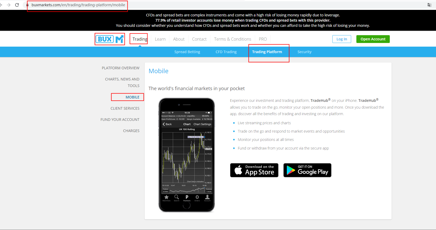 Regarding your question, we located relevant information in the "Trading Platform - MOBILE" section on BUX Markets official website. We would recommend contacting the customer service to get the most accurate and current answer. For more details about this broker, please refer to our full review of BUX Markets.