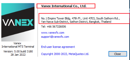 Probing further into this broker, we deem that VANEX is a clone firm that falsely uses regulatory information of the licensed entity. We downloaded its MT5 platform and noticed that this broker is owned by a Thai company named "Vanex International Co.,Ltd" rather than the regulated firm "VANEX LIMITED". So VANEX is actually not regulated by any financial regulator. That means investors' funds in this broker is unsafe and cannot be protected by any laws. Therefore, it is thoroughly a scam.