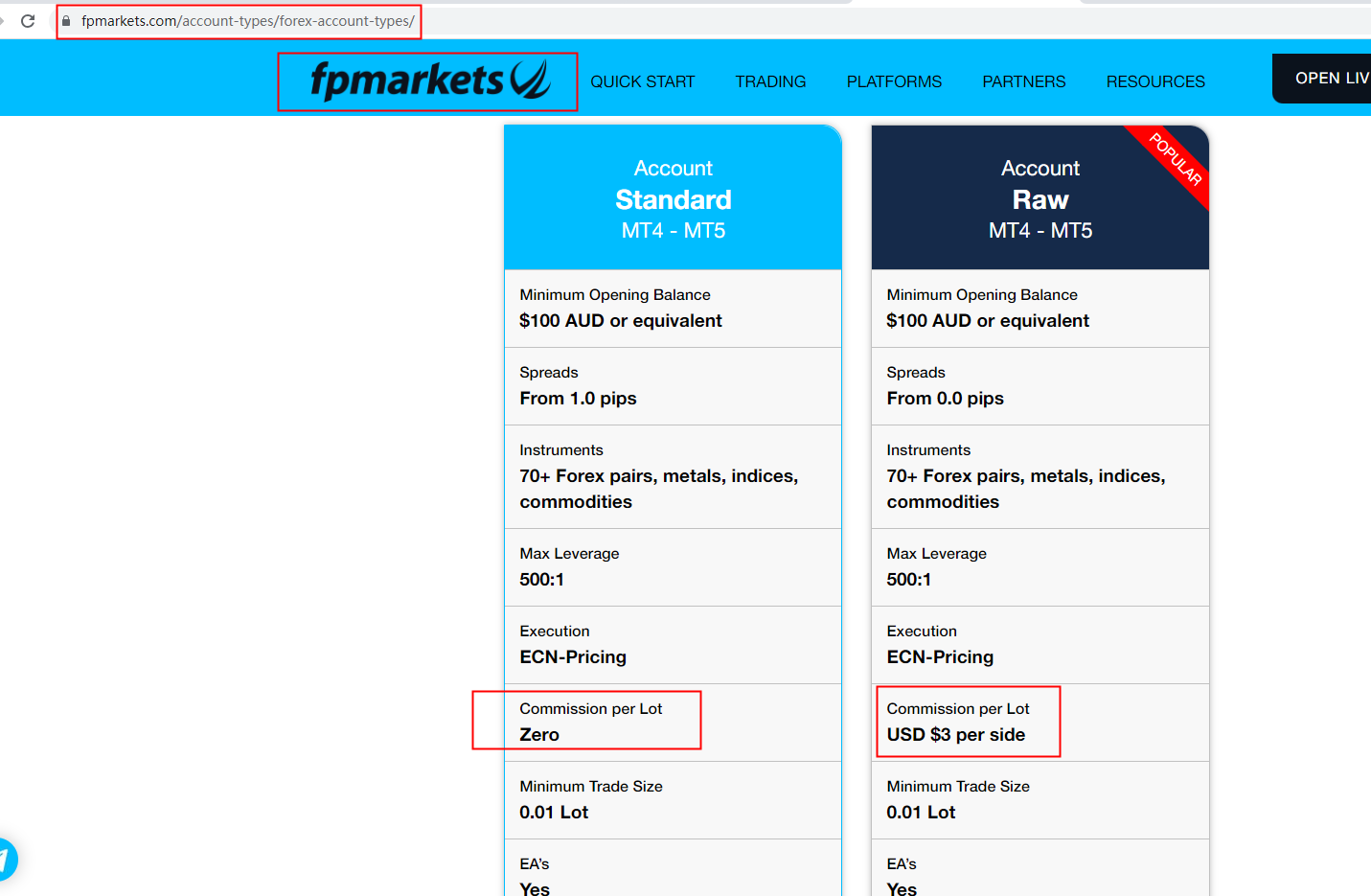 FP Marketscharges commission which varies based on the account type. The screenshot below shows where the relevant information is on their official website. However, to achieve the most accurate and current answer, we recommend that you ask the official customer services directly. For more trading details, please check our full FP Markets review.
