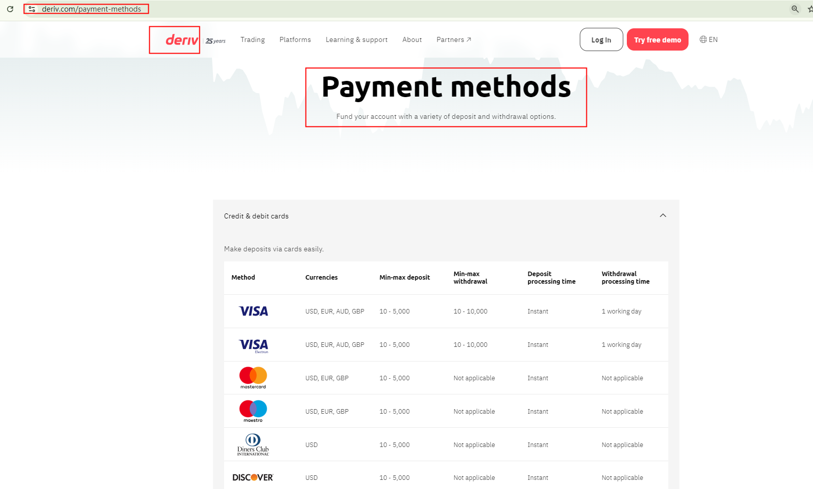 Deriv has published details about deposits and withdrawals, including processing times, on their website. For more information, you can view this online or contact their customer service for any inquiries.