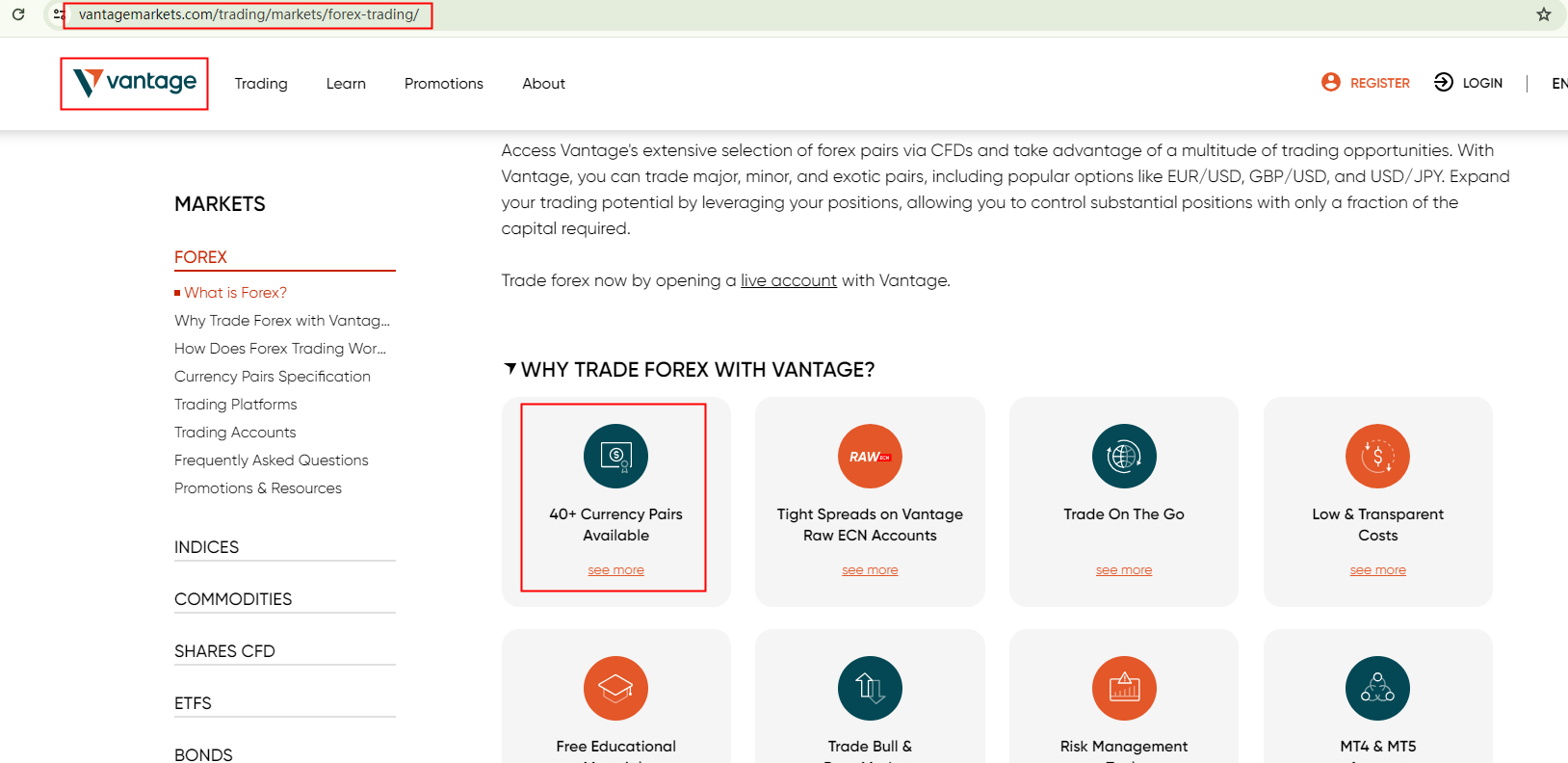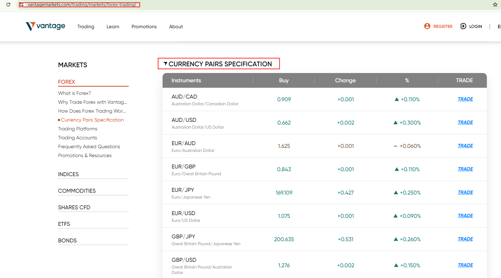 According to the Vantage FX website, over 40 currency pairs are available for trading. This information can be found under the "Trading" category. On the same page, specifications about the pairs are also listed.