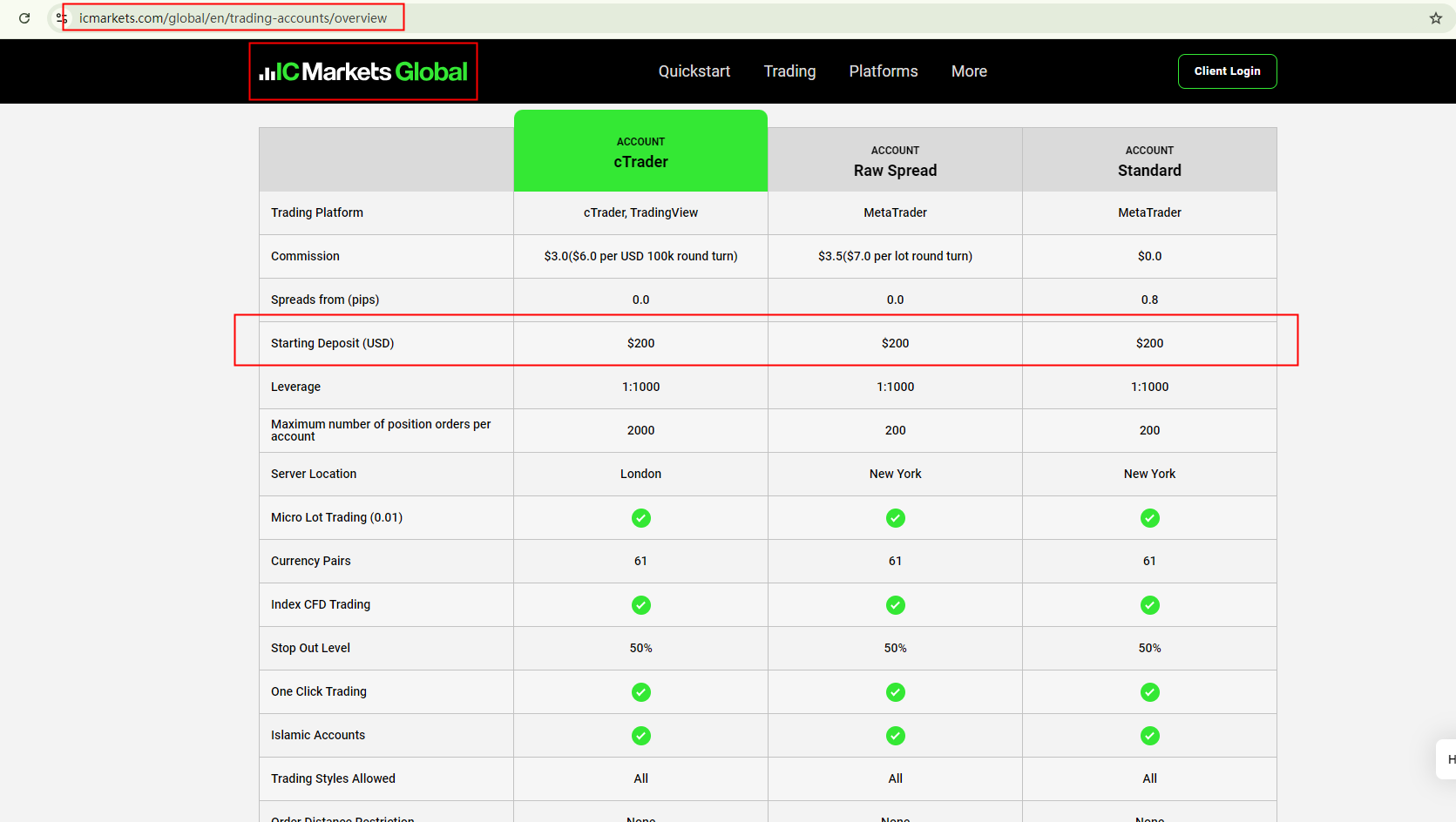 The minimum deposit required to open an account with IC Markets is $200. This applies to all their account types, including cTrader, Raw Spread, and Standard accounts. You can read these details on their Trading Account Overview page.
