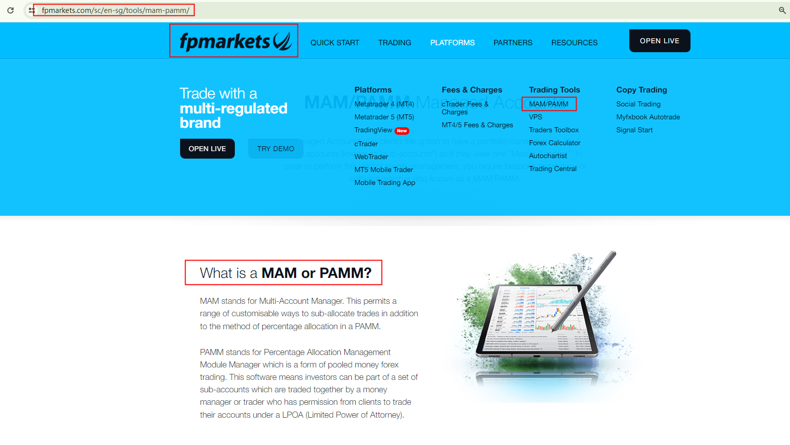 This information is sourced from FP Markets, as indicated in the attached screenshot of their website. FP Markets provides these tools and explicitly explains the terms, the benefits they offer, and how they function. You can find all these details on the "Mam-Pamm" page under the "Platforms-Trading Tools" section. For any further inquiries, it is recommended to contact their customer service.