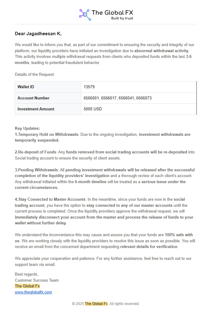 TheGlobalFX ltd, Address: 8FVQ+8W Providence, Seychelles, regulated by the Financial Services Authority of Seychelles. is the broker who provide social trading option where i invested 5000USD in the year of 2023 and started copying a strategy called "Nexusewave" , until March 2025 they paid profit on time and i had an emergency so i asked them to close my account and settle my investment but as of now there is no proper response from their side also they didn't paid profit from last 2 months