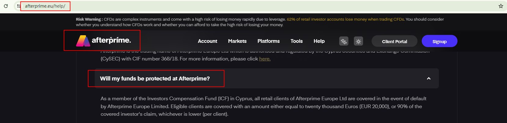 Afterprime is a licensed broker under the jurisdiction of the Cyprus Securities and Exchange Commission (CySEC). Brokers subject to the authority's oversight are required to keep client funds separate from their own and provide the Investor Compensation Fund. As stated in the Help Section of Afterprime's website, "Eligible clients are covered with an amount either equal to twenty thousand Euros (EUR 20,000), or 90% of the covered investor's claim, whichever is lower (per client)".