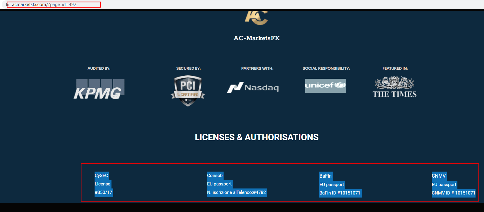 ACMarketsFX does not fall under any regulation and should be avoided at all events. ACMarketsFX claims to be a "Licensed EU Investment Firm & Liquidity Provider" which is supervised and regulated by the Cyprus Securities and Exchange Commission (CySEC) with CIF Licence number 350/17. Besides, it also states its EEA licenses respectively issued by Italy CONSOB (License No. 4782), Spain CNMV (License No. 10151071), and Germany BaFin (License NO. 10151071).