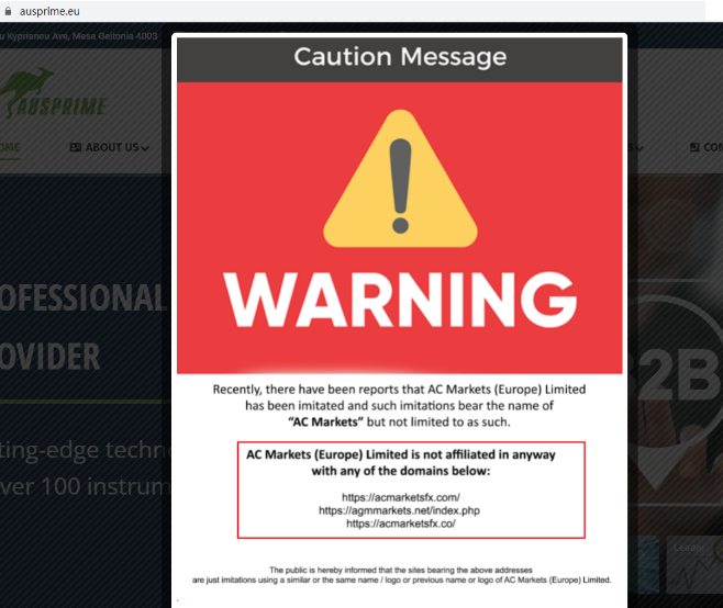 2) When visiting the official domain of regulated entity-https://ausprime.eu/, a pop-up attention informs visitors that ACMarketsFX, under the domain https://acmarketsfx.com/, is using their license without authorization. The entity also mentions it is not affiliated in any way with ACMarketsFX.