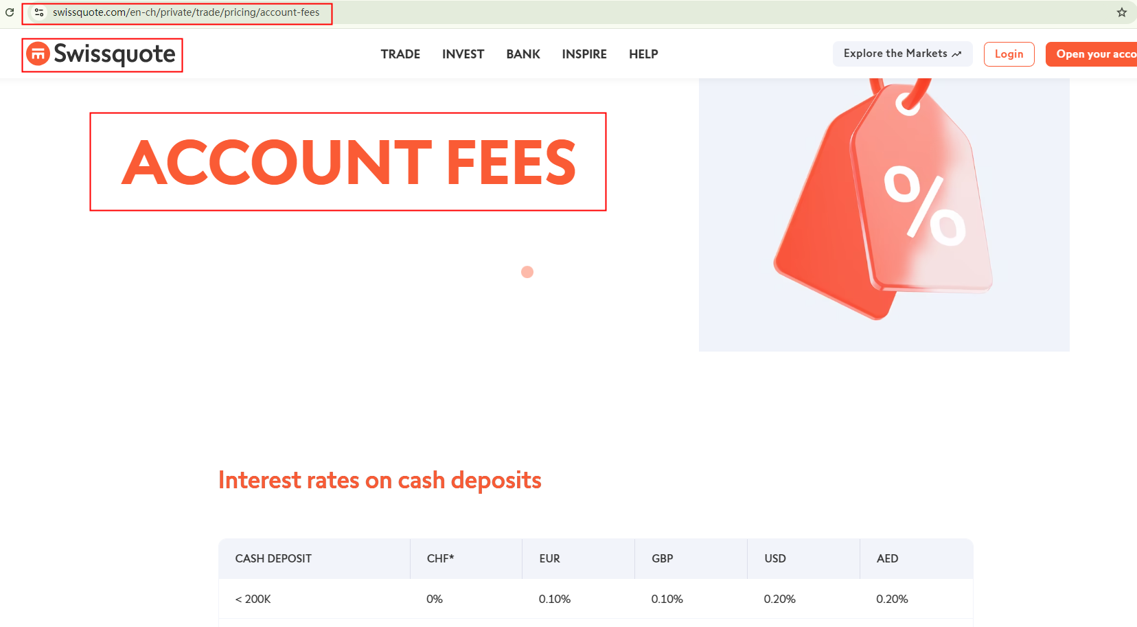 Thank you for reaching out. Swissquote has a dedicated page that details the fees associated with trading and account management, including interest rates on cash deposits, custody fees, and payment fees. You can visit this page for a comprehensive overview. It is located under the Trade Category on their official website. For further inquiries, we recommend contacting their customer service.