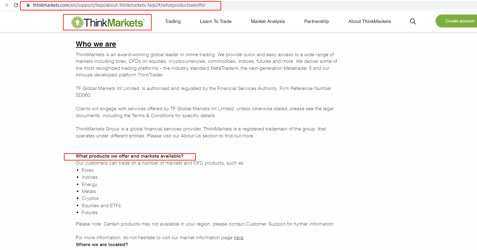ThinkMarkets provides a variety of assets to trade, such as Forex, indices, and energy. The screenshot below can help in locating the relevant information and you can read more details there. As suggested by the broker, it is advisable to contact their support team for further information. For more details about this broker, please refer to our full review of ThinkMarkets.