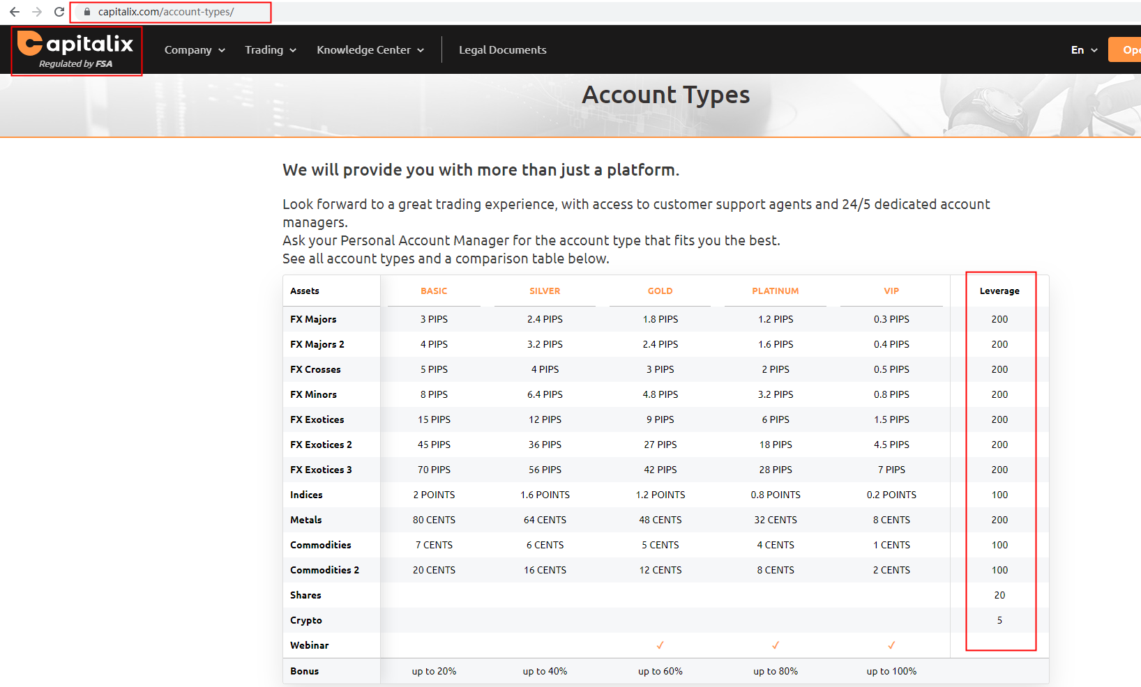 Capitalix provides a comparison table in its "Account Types" section, where available leverage varies based on the assets. The screenshot below may help in locating the information on their website. To achieve the most accurate and current answer, however, we would recommend contacting customer service via their official website. For more details about this broker, please refer to our full review of Capitalix.
