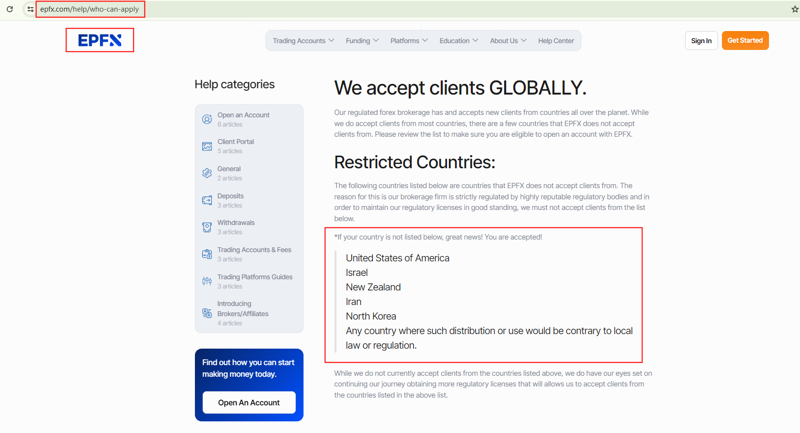 Based on the information available on EPFX's website, the regional restrictions are illustrated in the attached screenshot, which we provide for reference purposes. For the most accurate information, we recommend contacting their customer service.