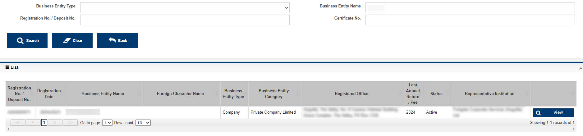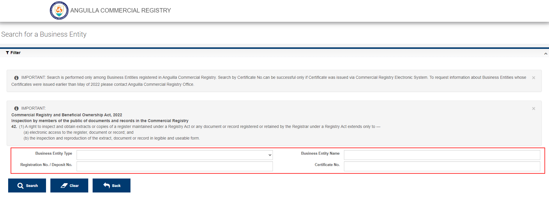 Search is performed only among Business Entities registered in Anguilla Commercial Registry. Search by Certificate No.can be successful only if Certificate was issued via Commercial Registry Electronic System. To request information about Business Entities whose Certificates were issued earlier than May of 2022 please contact Anguilla Commercial Registry Office.