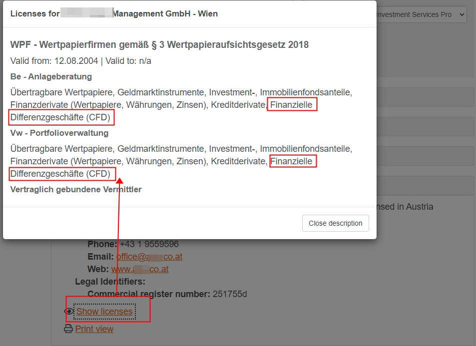 3. And you'll get the broker's contents on Austria FMA website. At this time you will click the 'Show licenses' and check if the broker has the authorization to provide 'Finanzielle Differenzgeschäfte (CFD)';