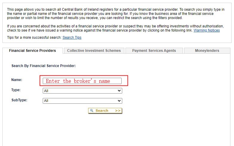 1) Enter the name into the search bar on http://registers.centralbank.ie/FirmSearchPage.aspx ;