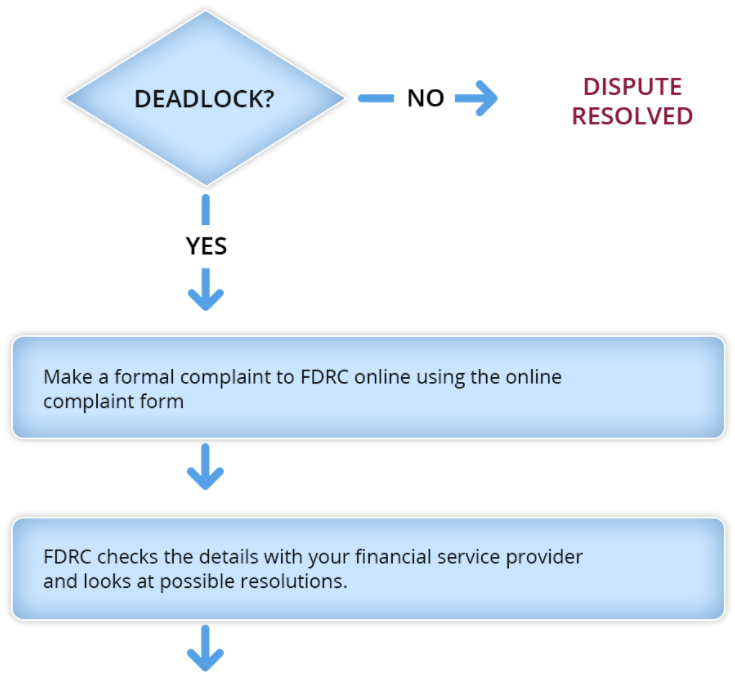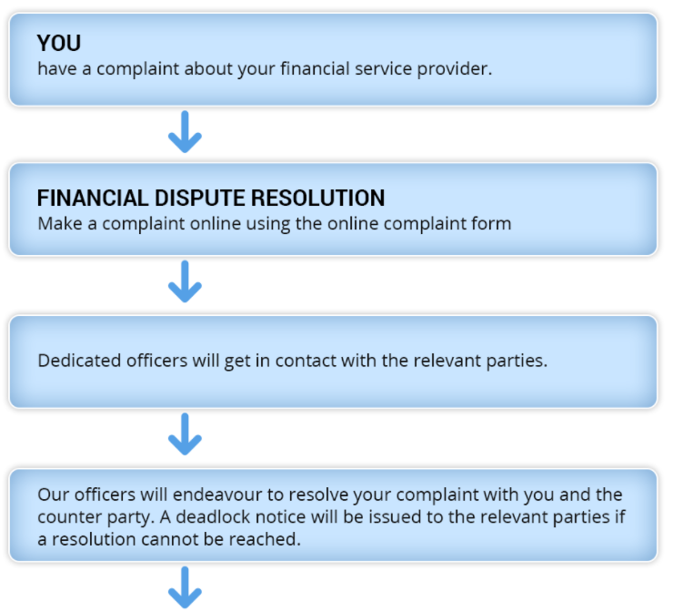1st way: The recommended way is to contact the financial service provider directly and discuss with them to find a solution. Email Compliance.handling@fdrc.org.uk to get the contact information of the provider. The member company should notify the customer that the complaint has been received within 5 days, and respond to the complaint within 14 days according to its internal dispute resolution (IDR) procedure.