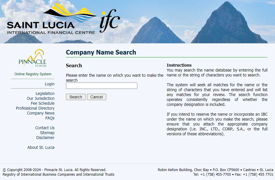 Go to https://www.pinnaclestlucia.com/registry/searchname.jsp and enter the name of your targeted company.