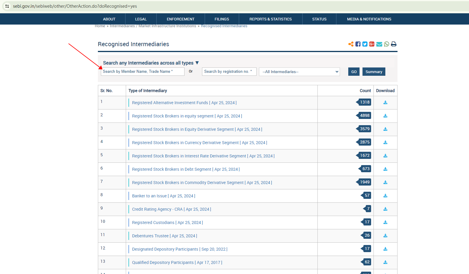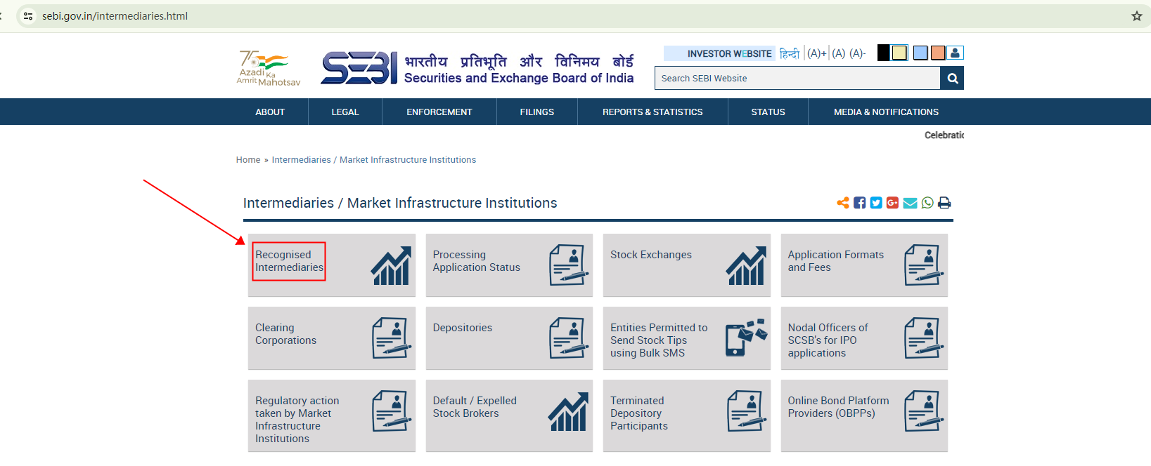 1. Visit the SEBI's official website at https://www.sebi.gov.in/. Scroll down to find the button labeled "Intermediaries / Market Infrastructure Institions" and click on it. This will take you to a new page. On this page, look for the button labeled "Recognised Intermediaries" and click on it.