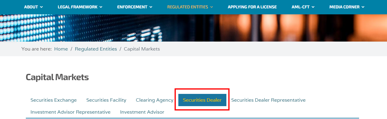 2. Choose the 'Securities Dealer' and search the broker's name in the list on https://fsaseychelles.sc/regulated-entities/capital-markets ;
