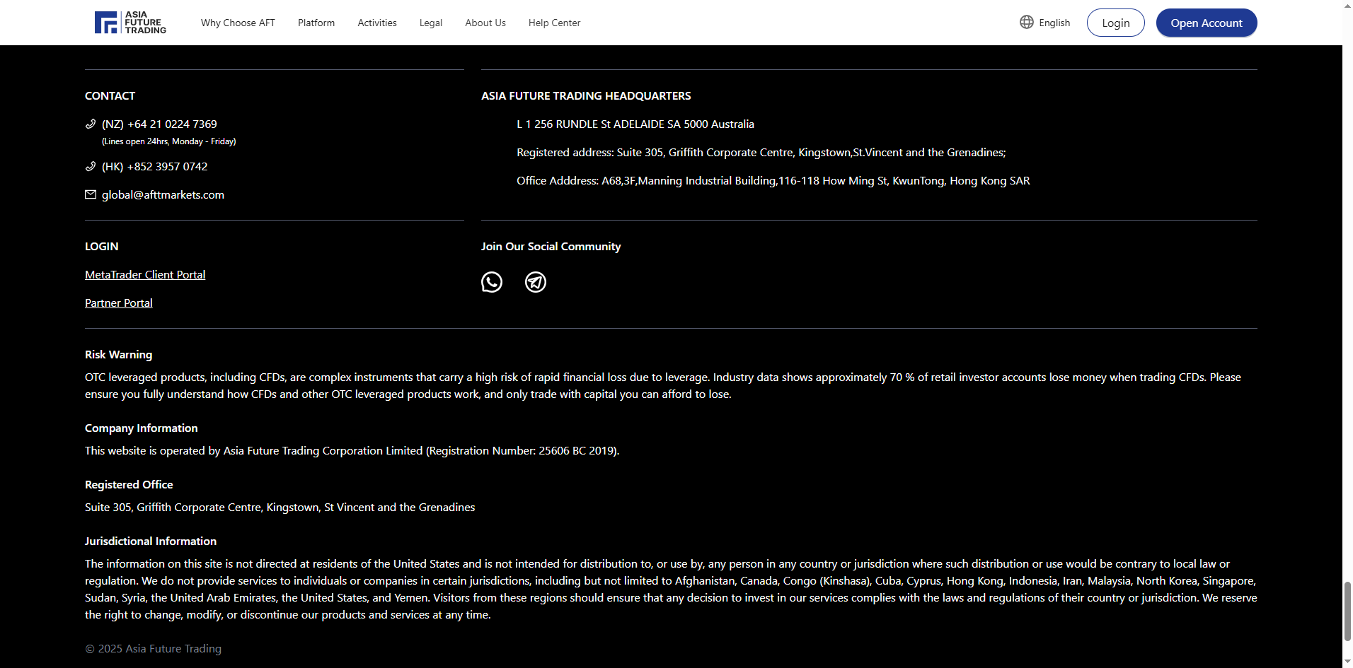 经过我们的调查,Asia Future Trading 声称总部位于澳大利亚并受 ASIC 监管;然而,其 ASIC 状态为“已停止”,这意味着它不再获得授权或监管,使其运营非法且风险高。虽然在圣文森特和格林纳丁斯注册为国际商业公司,但这并不构成合法的金融监管。此外,尽管声称在香港有业务,但证监会没有发现任何发牌记录,表明存在未经授权的活动。 综上所述, Asia Future Trading目前在没有任何信誉良好的金融监管机构有效监督的情况下运营,给投资者带来了重大风险。