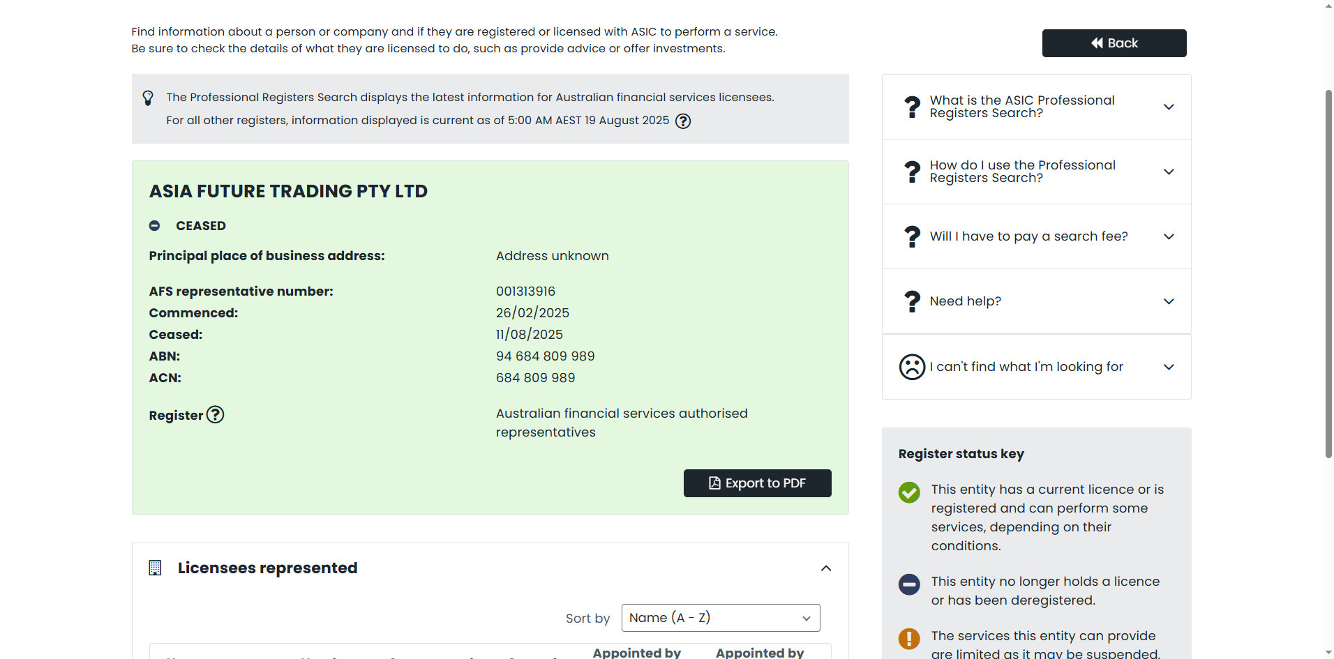 ANSWER Dear Investor, Following our investigation, Asia Future Trading claims to be headquartered in Australia and regulated by the Australian Securities and Investments Commission (ASIC). While we did locate the company’s name in ASIC’s database, its status is clearly marked as “Ceased”. This indicates that the company is no longer authorized or supervised by ASIC, exposing Australian investors to significant risk. Additionally, the company claims to be registered in Saint Vincent and the Grenadines. We confirmed a registration in the system of Financial Services Authority (FSA) of Saint Vincent and the Grenadines; however, this only verifies its status as an International Business Company (IBC). Such registration provides no financial oversight and should not be mistaken for legitimate regulatory supervision or compliance. Although Asia Future Trading states it has an office in Hong Kong, our search of the Securities and Futures Commission (SFC) of Hong Kong’s official licensing database revealed no record of any valid license held by this company or its related entities. The absence of such a license suggests that its operations in Hong Kong are unauthorized. In summary, Asia Future Trading currently holds no valid financial license from any reputable regulatory authority and is effectively operating without oversight. We strongly advise you to exercise extreme caution and avoid investment activities with Asia Future Trading to protect yourself from potential financial loss.