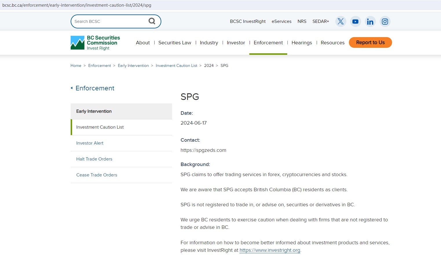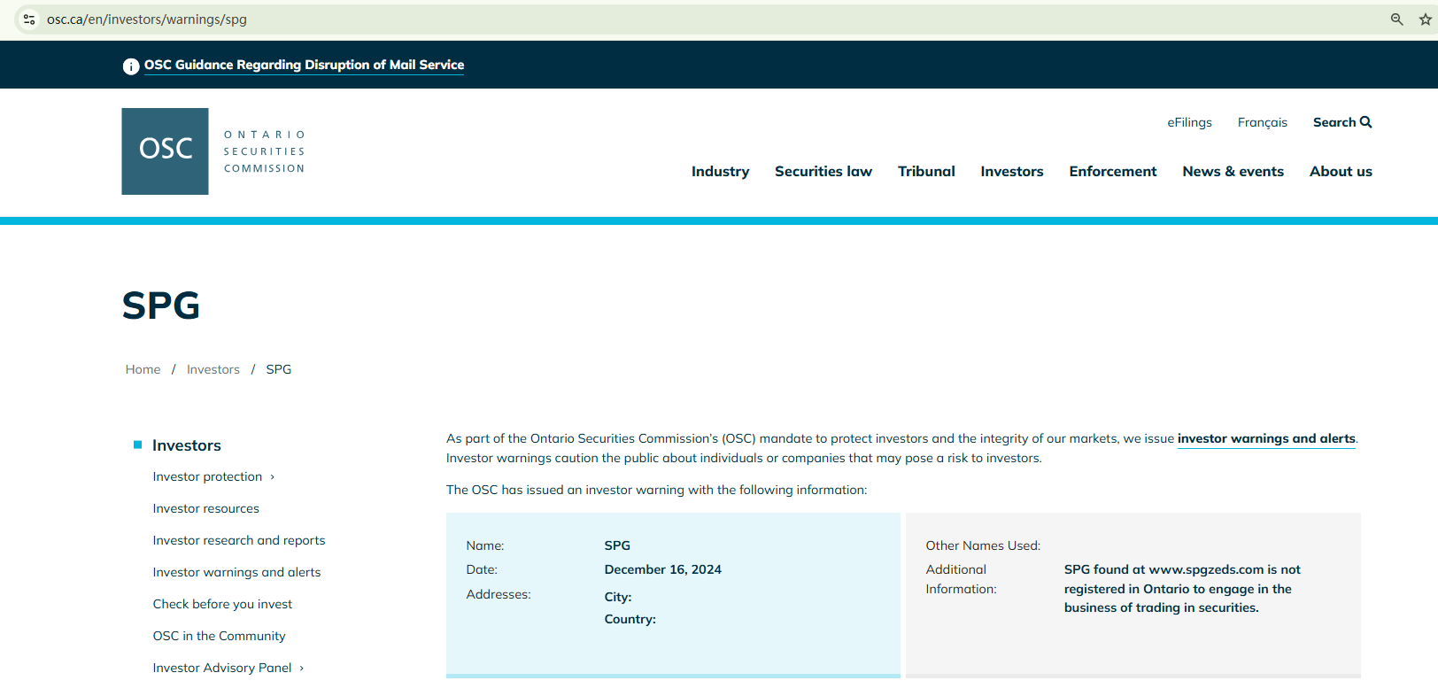 2024年12月16日,安大略省证券委员会(OSC)发布警告,指出SPG这家经纪商未在安大略省注册,不具备从事证券交易业务的资格。https ://www.osc.ca/en/investors/warnings/spg